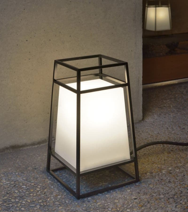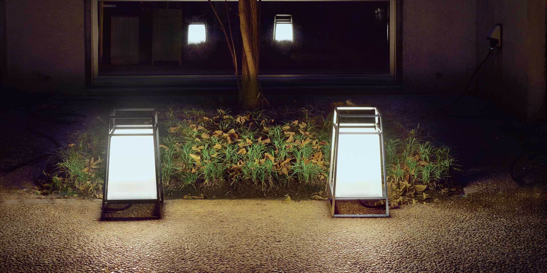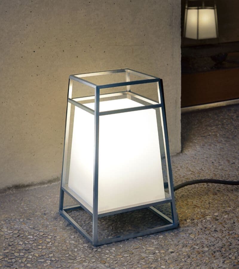 角型、円筒型の器具と同様のコンセプトでデザインされていますが、伝統的な露地行燈の形である裾広がりの台形スタイルを生かしつつ現代的な空間にも似合うフォルムを求めて製作しました。従来の露地行灯につけられた機能本位な「取手」の代わりに、極細のステンレスフレームを上部まで立ち上げ、シンプルなデザインと一体化した持ち手としました。安定感のある小ぶりなエクステリアライトとして簡単に移動ができるので、季節や人の流れの変化により、効果的な照明演出ができます。フレームの角度をつける溶接には高度な技術が必要とされ、アクリルシェードもすべての断面に微妙な角度をつけるため製作に非常に手間がかかる器具です。