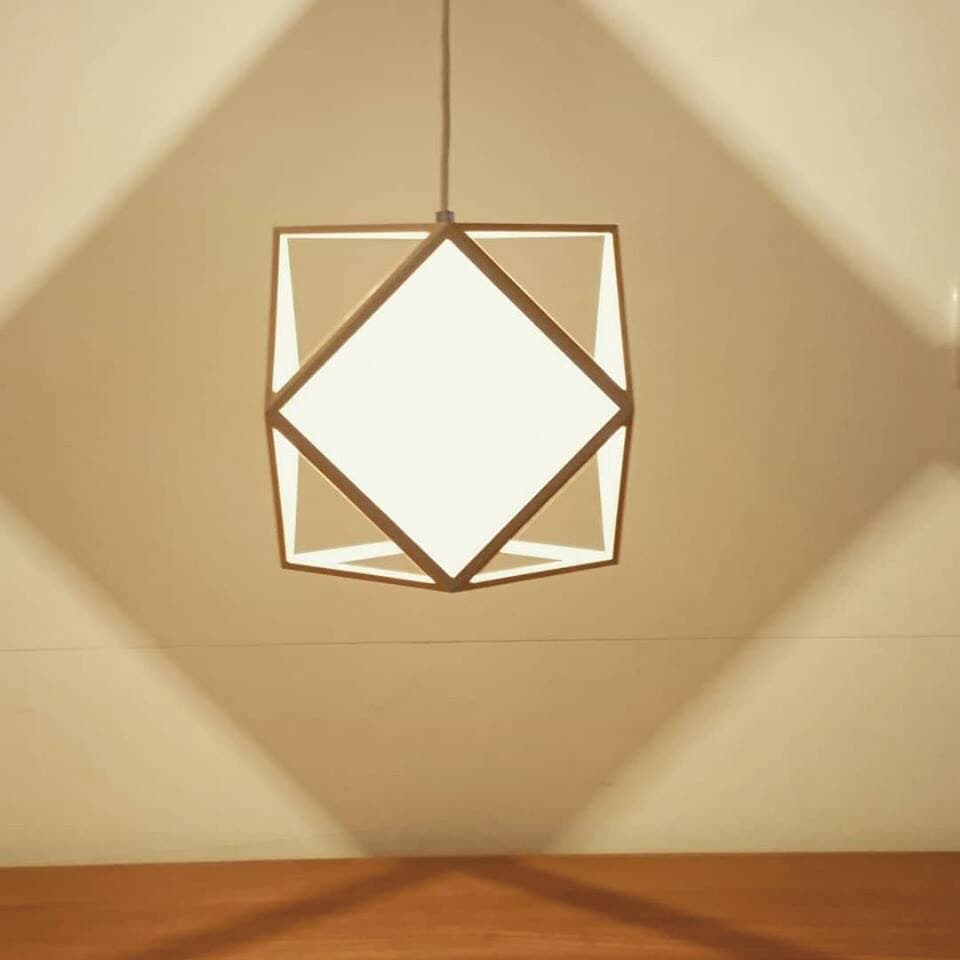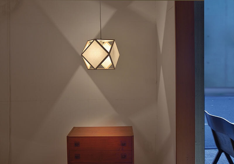 四角形と三角形で幾何学的に組み合わされたデザインはアート・オブジェのように部屋のアクセントになります。フレームの四角形部分のみに和紙セードを貼ることによって、クリアタイプLED電球のそのままでは眩しい光線はソフトに拡がる光と、三角形部分からのストレートな光に分割され、室内に光と影の美しいパターンが投影されます。このペンダントのユニークなデザインはそのまま「光の表情」を楽しむ仕掛けでもあります。