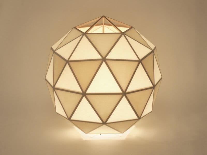 A combination of wooden triangles creates a voluminous spherical polyhedron. A single layer of ‘washi’ Japanese paper type fits well in a modern interior space while the alternately double-layered ‘washi’ type presents a subtle shade providing a sense of depth into the space.