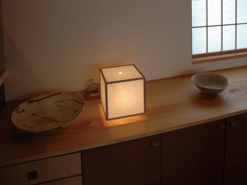 一辺20 センチの小型の正立方体のフォルムは照明器具というより「光の置物」とも言えます。熟練の職人の技が生み出した白木フレームの加工精度の確かさが冴えます。